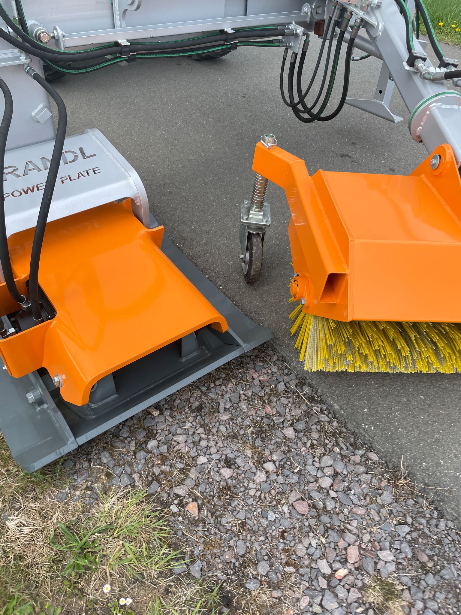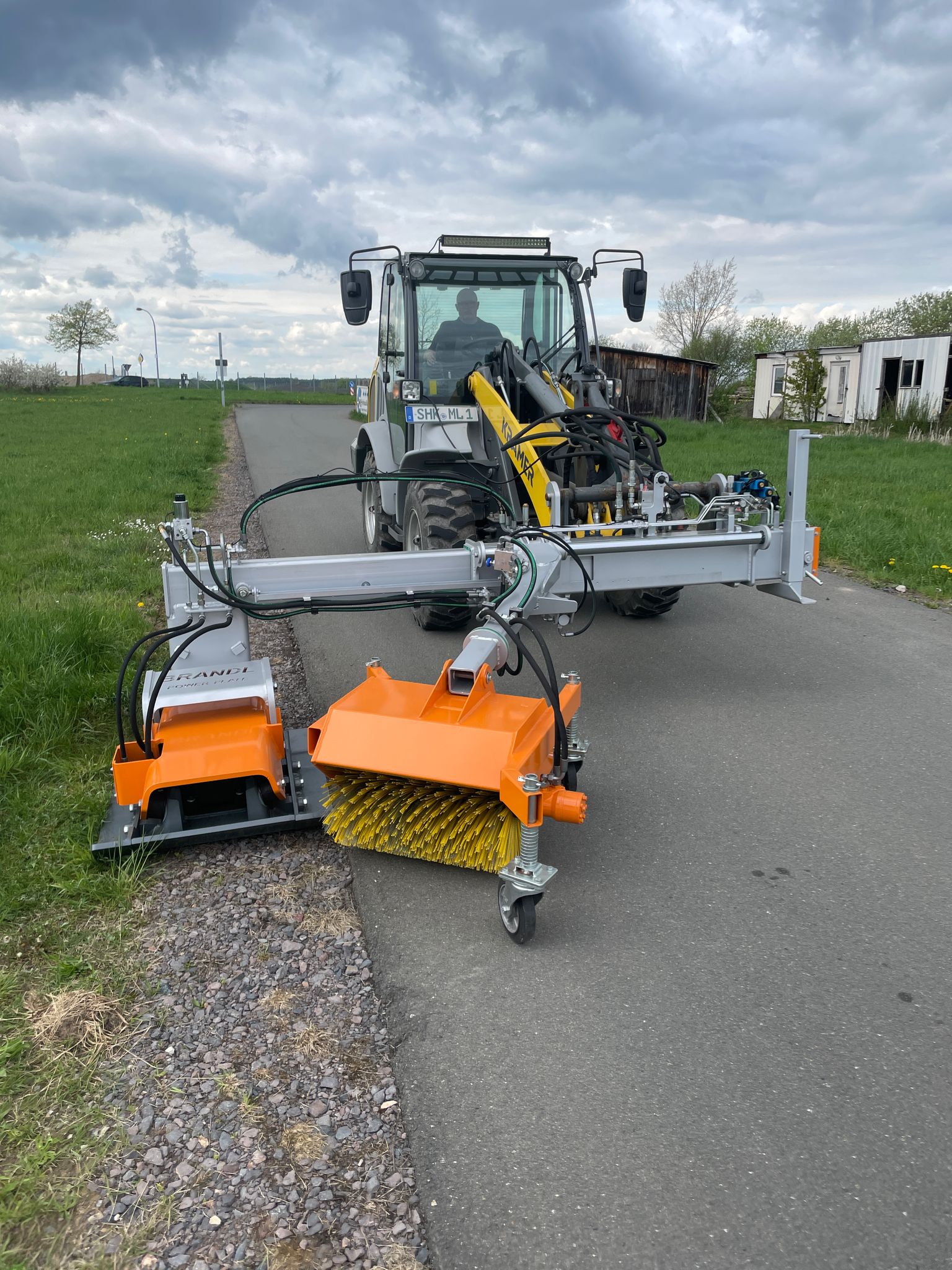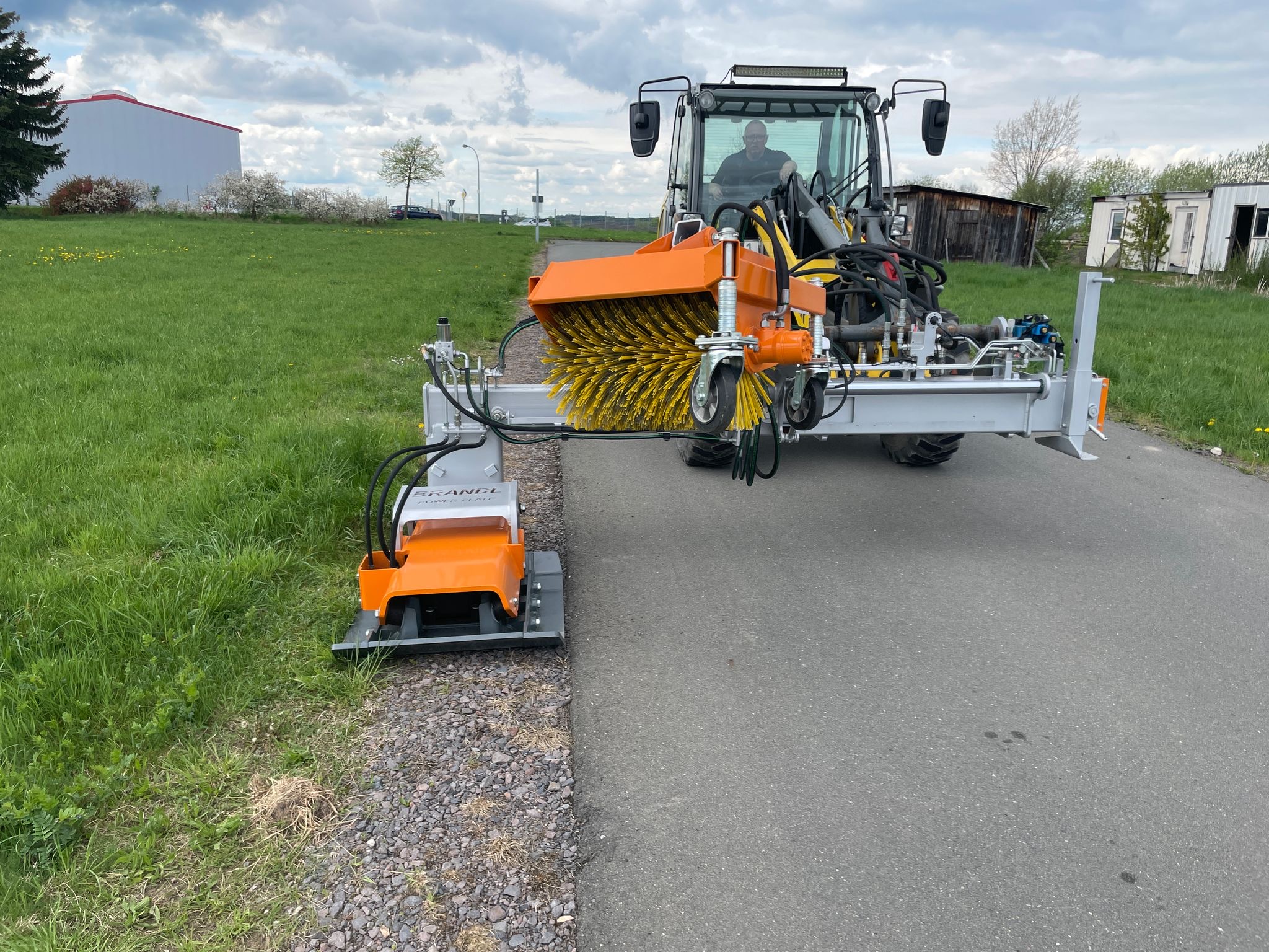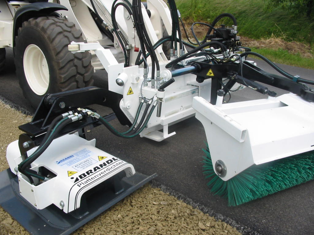 hydraulisch angetriebener, seitlich hydraulisch teleskopierbarer Einfachplattenverdichter mit vorlaufender Kehrmaschine für Radlader, Schlepper, Kommunalfahrzeuge - System BRANDL/BOMAG