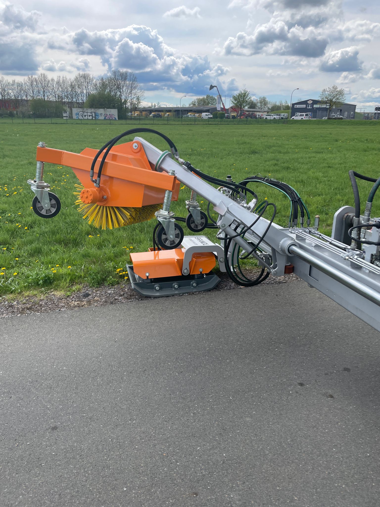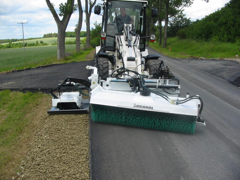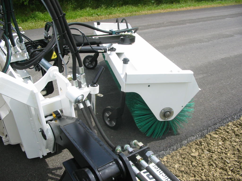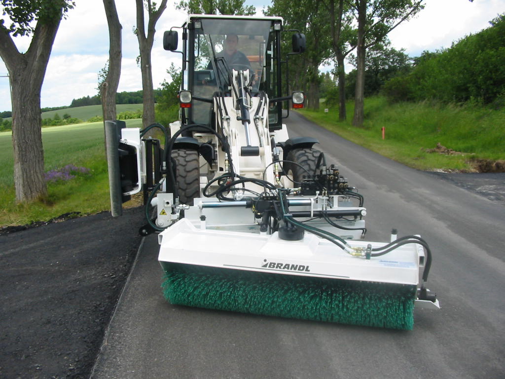 - vorlaufende Kehrmaschine 600 mm breit an Verschiebung des Plattenverdichter fest gekoppelt, Position und Schrägstellung Kehrwalze fest eingestellt