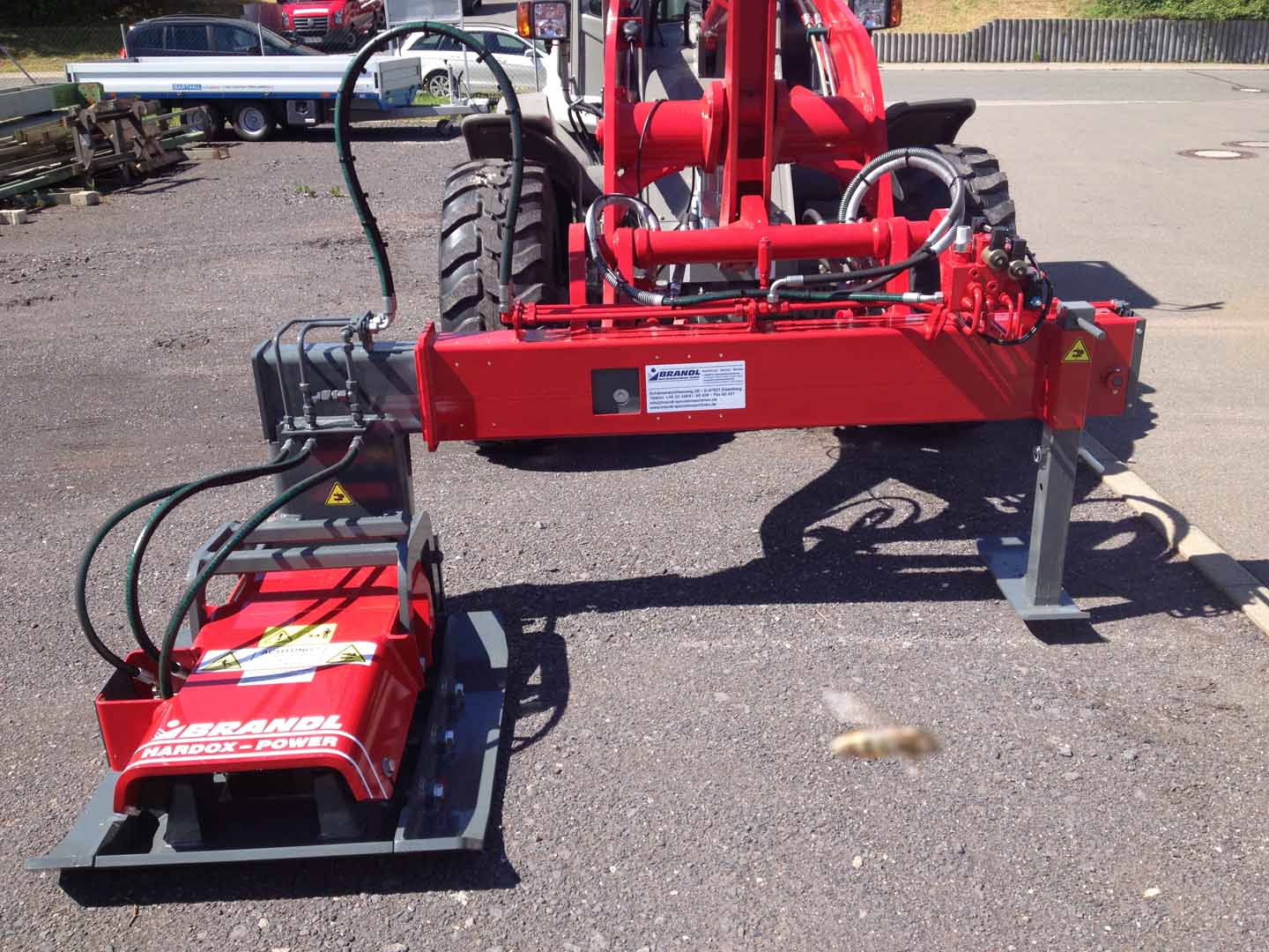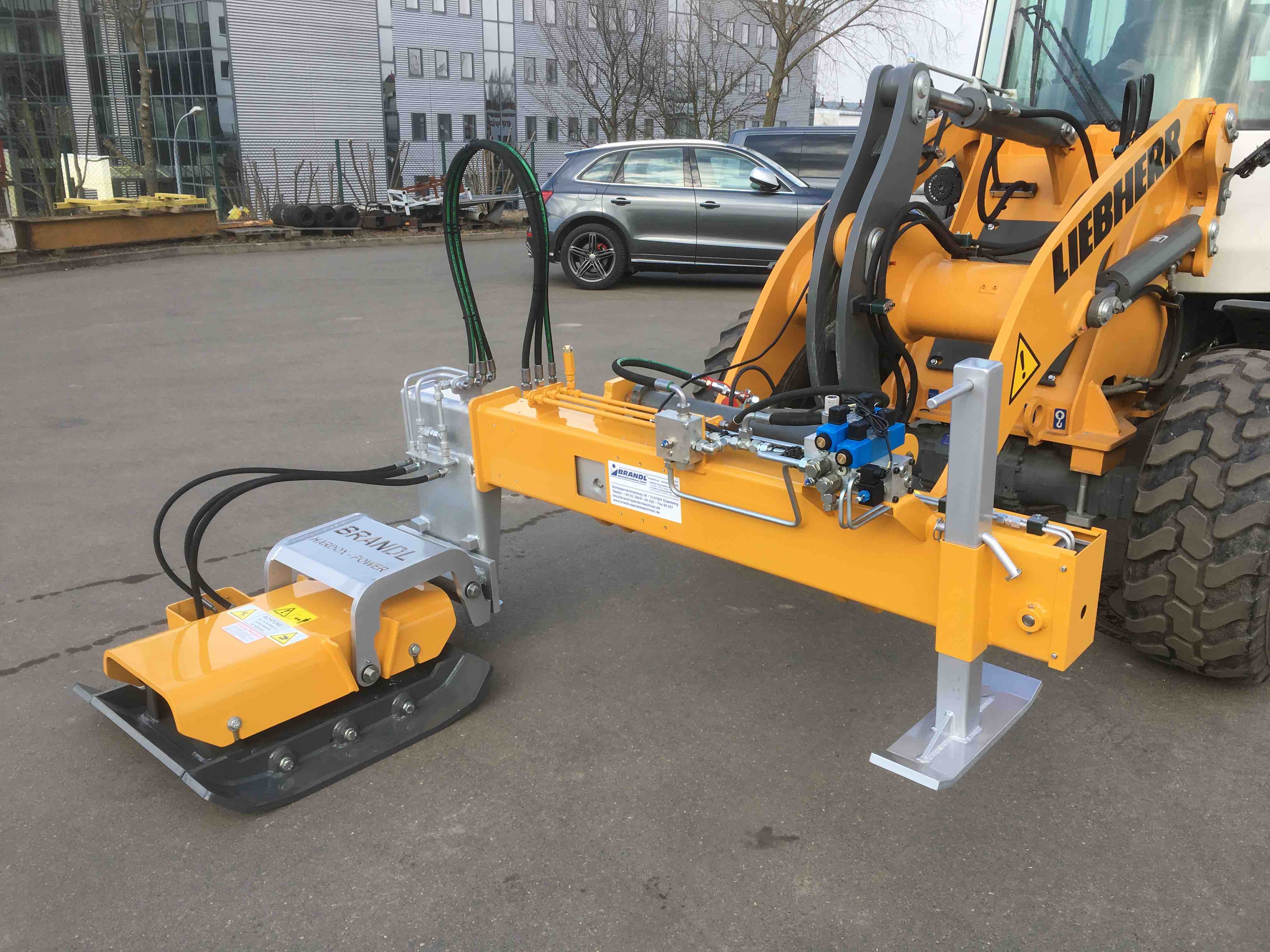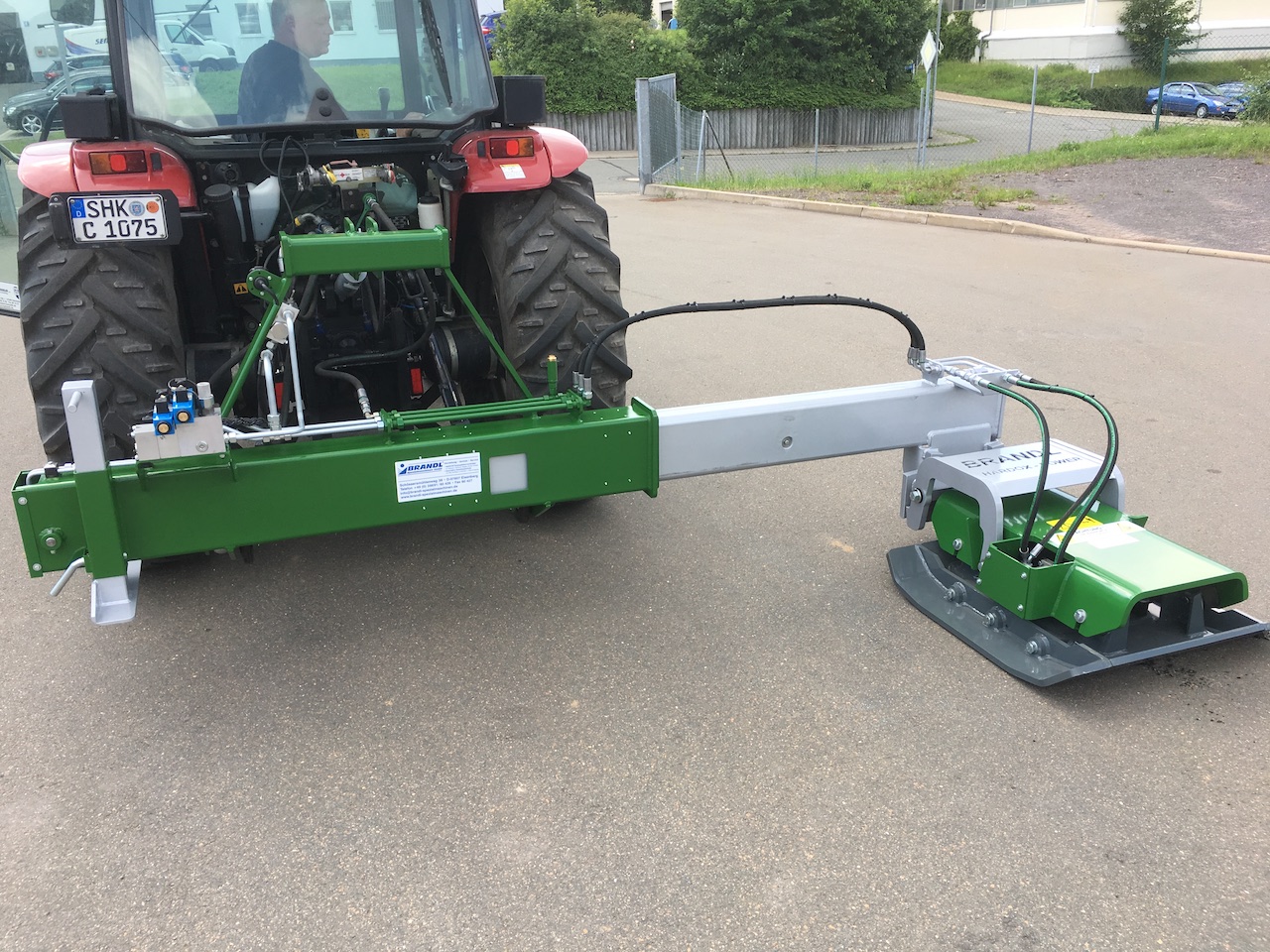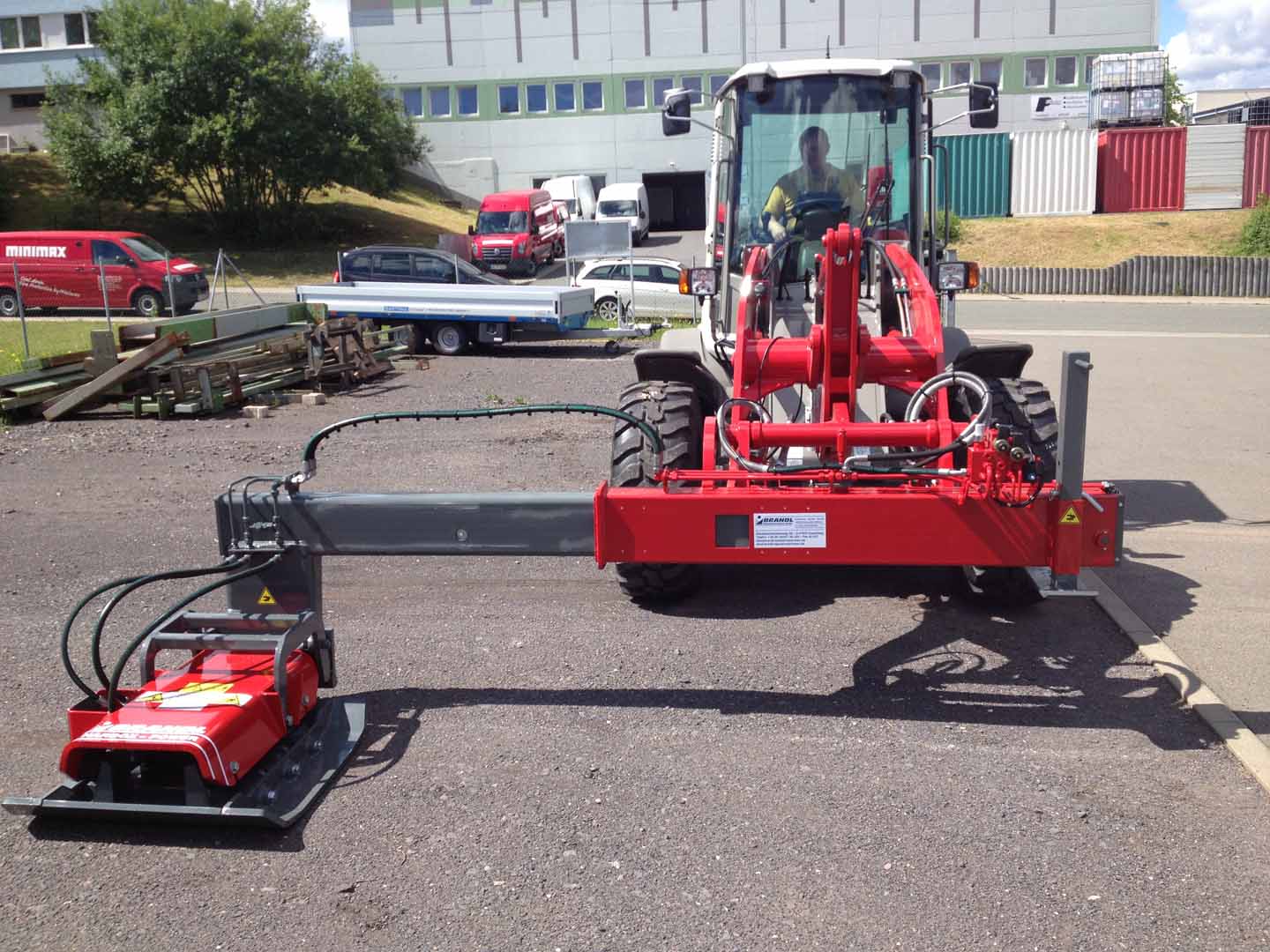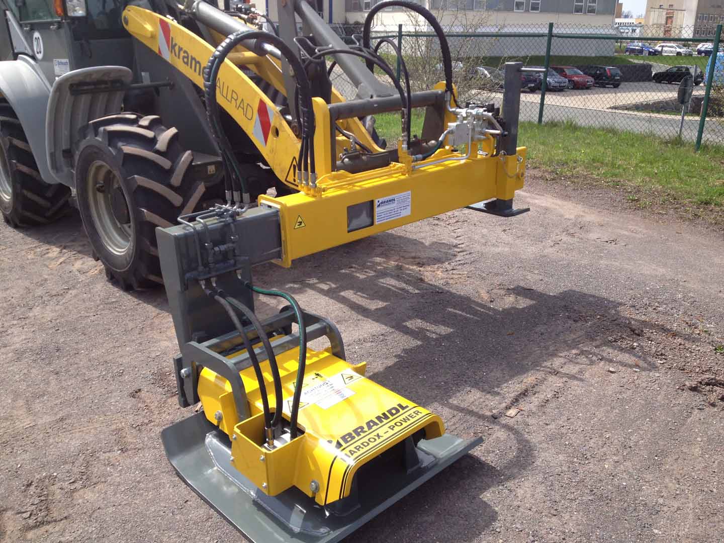 hydraulisch angetriebener, seitlich hydraulisch teleskopierbarer Einfachplattenverdichter für Radlader, Schlepper, Kommunalfahrzeuge - System BRANDL/BOMAG