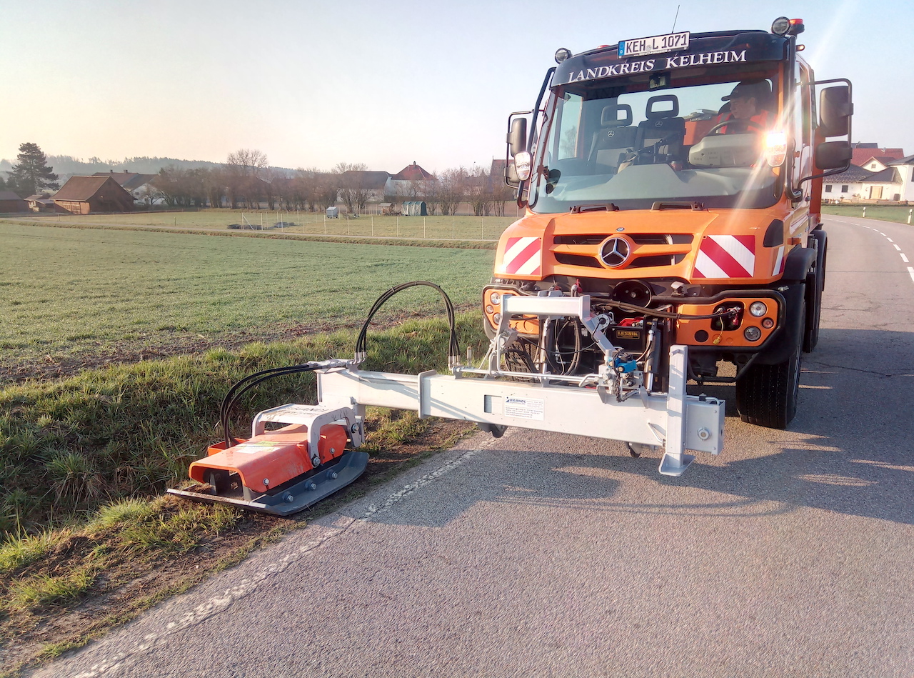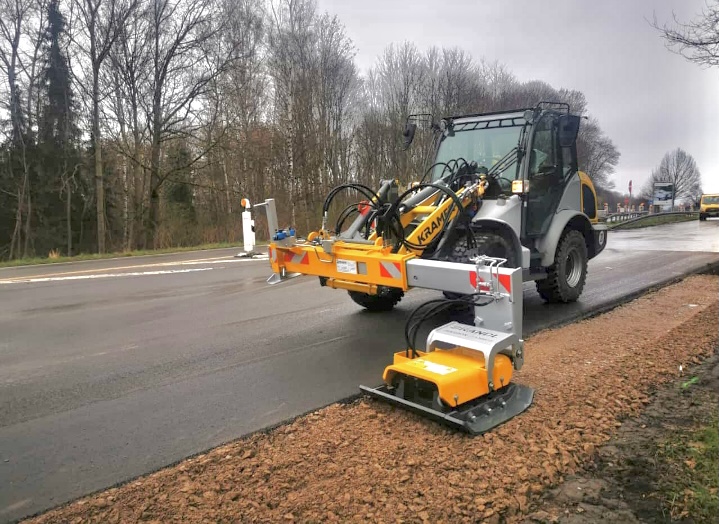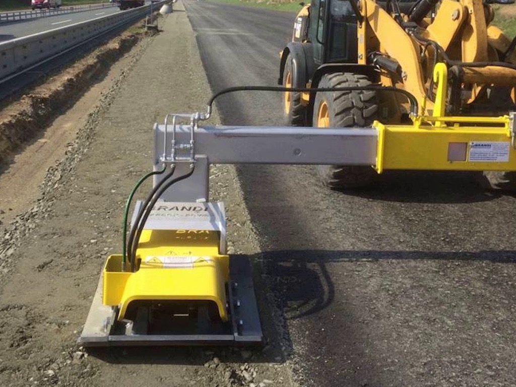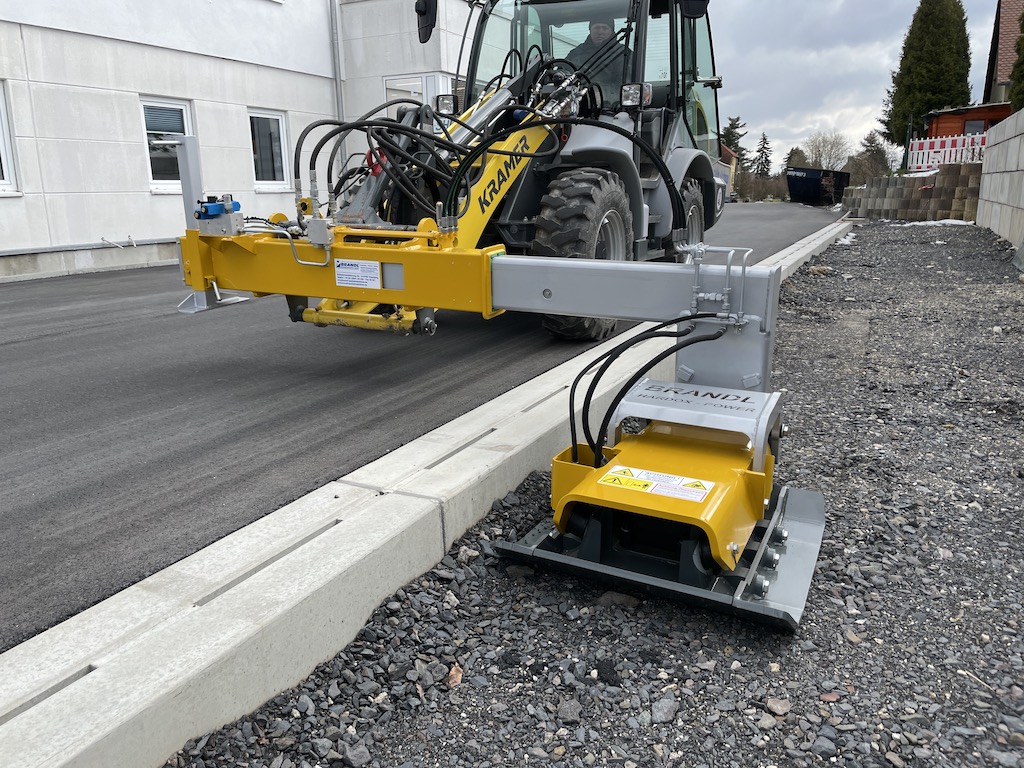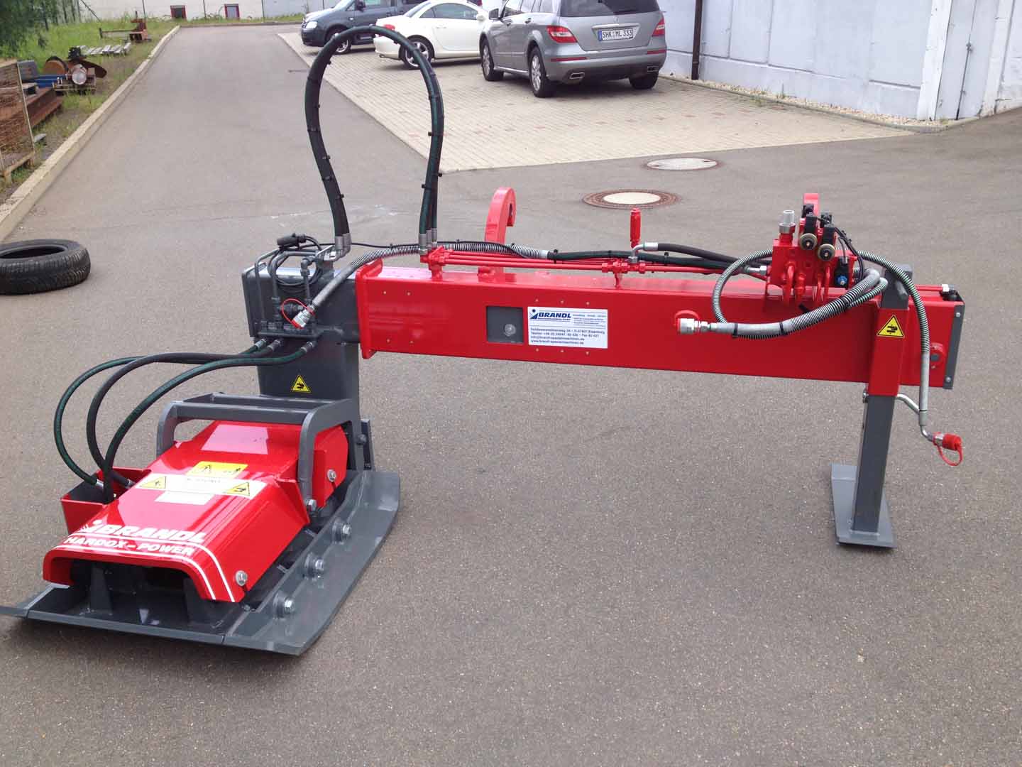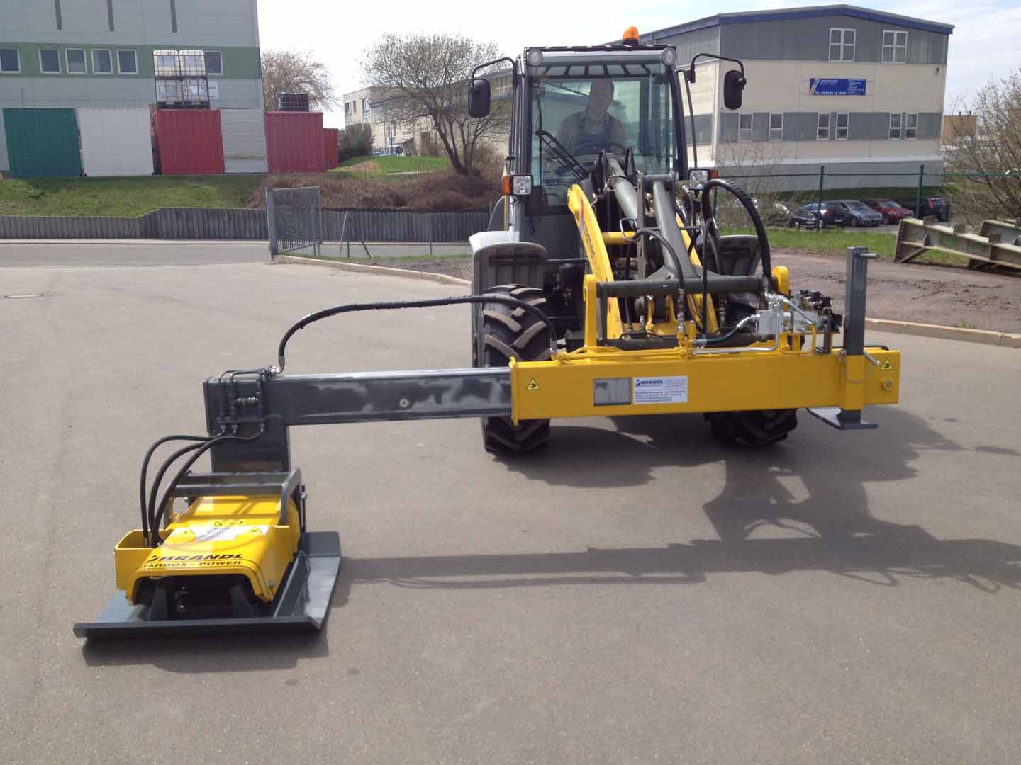hydraulisch angetriebener, seitlich hydraulisch teleskopierbarer Einfachplattenverdichter für Radlader, Schlepper, Kommunalfahrzeuge - System BRANDL/BOMAG