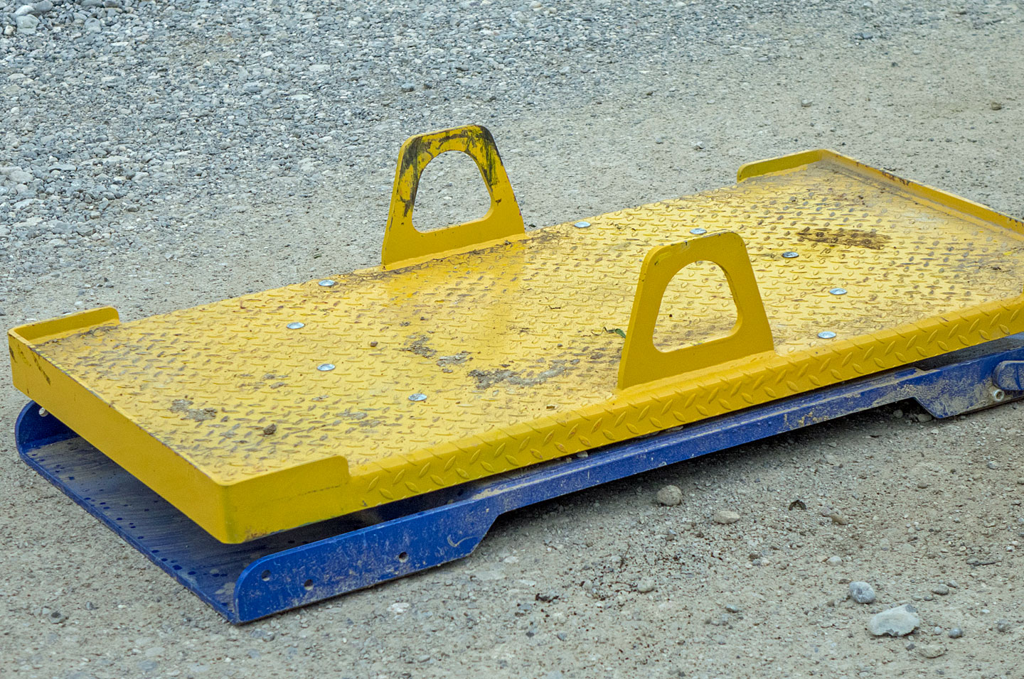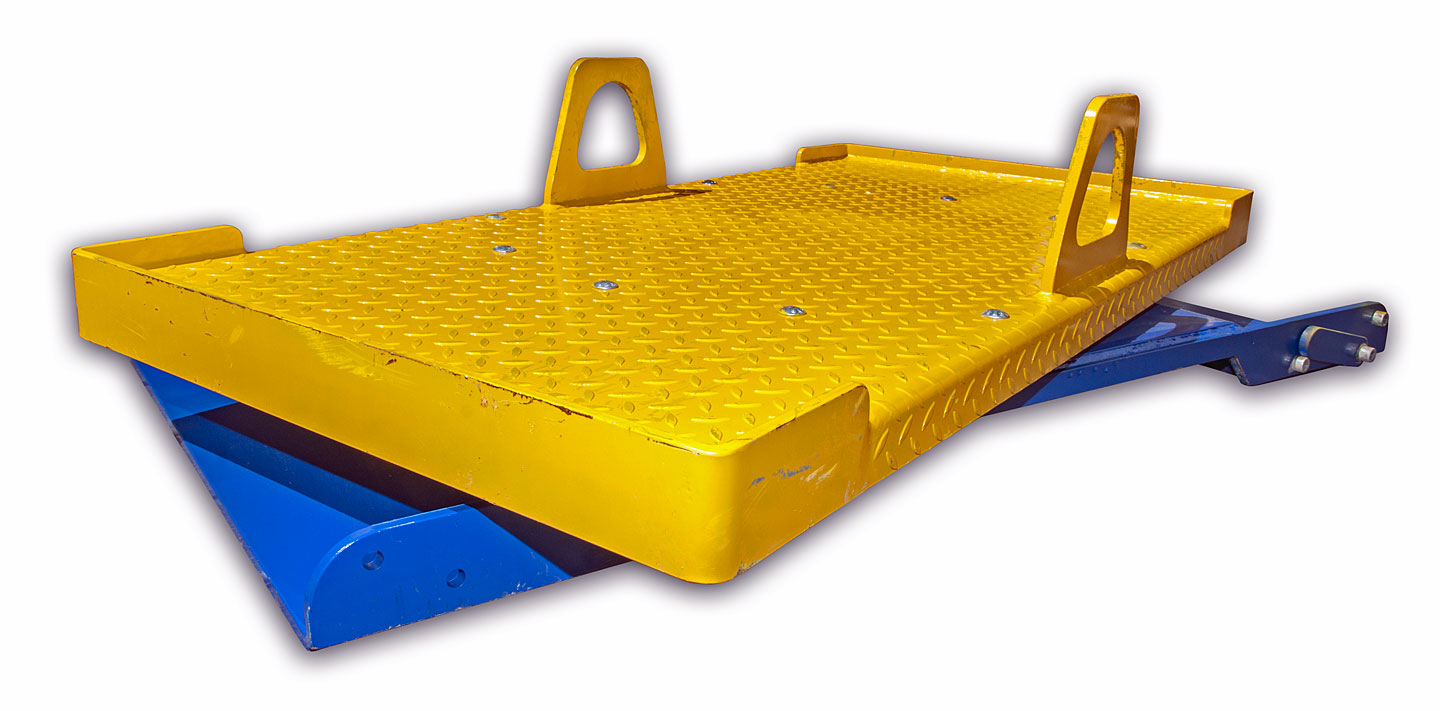 Der Gerätewender besteht aus Bodenplatte (blau) und Deckplatte (gelb), die zueinander stufenlos um 360° gedreht werden können. Für den Transport werden die beiden Platten mit einem Sicherungsbolzen manuell gegen unbeabsichtigtes Verdrehen gesperrt. Zwei groß dimensionierte Ösen ermöglichen das Anheben und den sicheren Transport, zum Beispiel mit Hilfe eines Verbaugreifers.