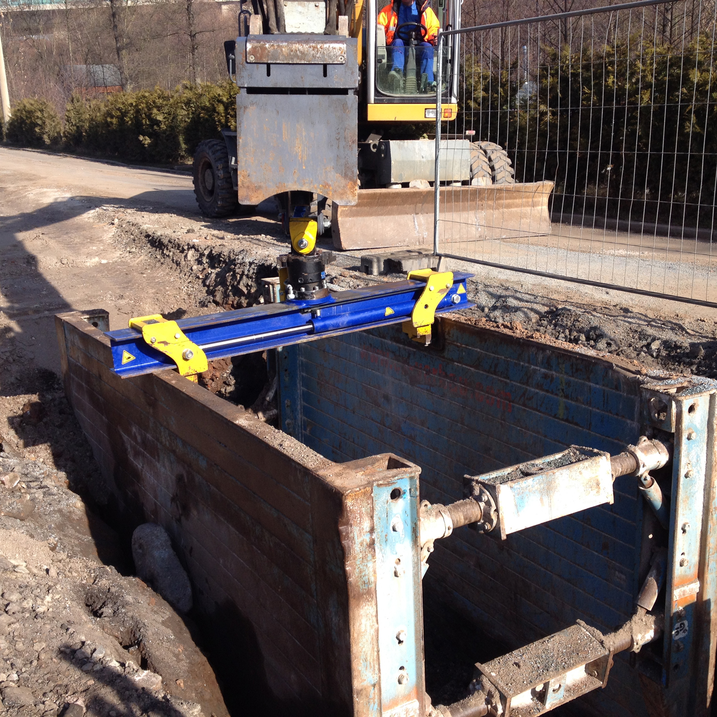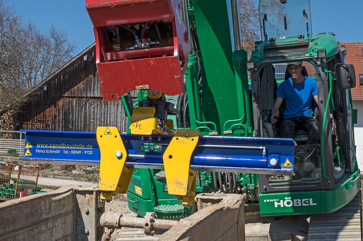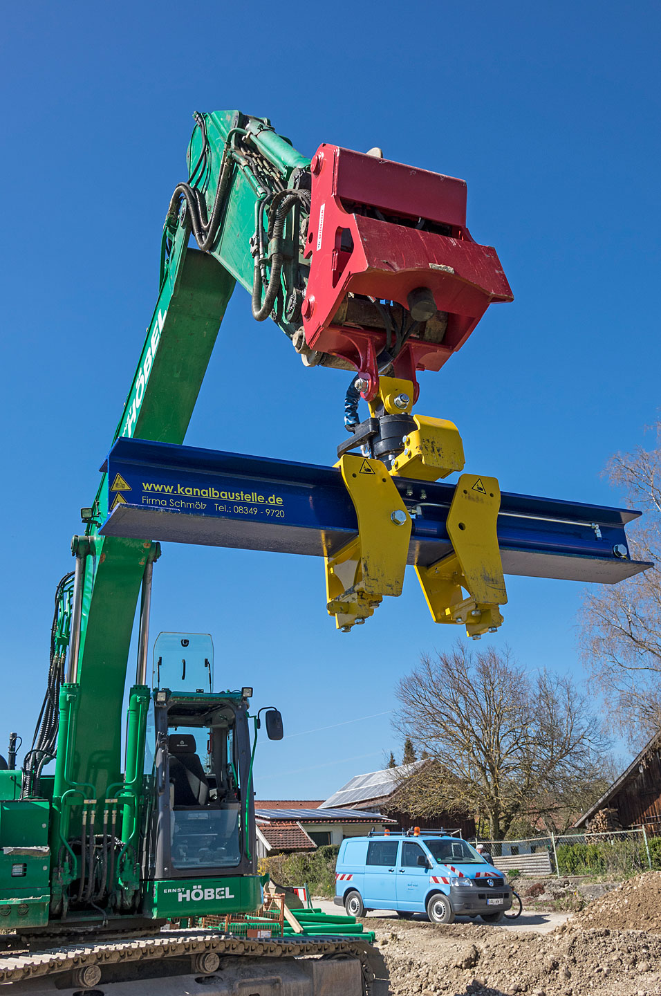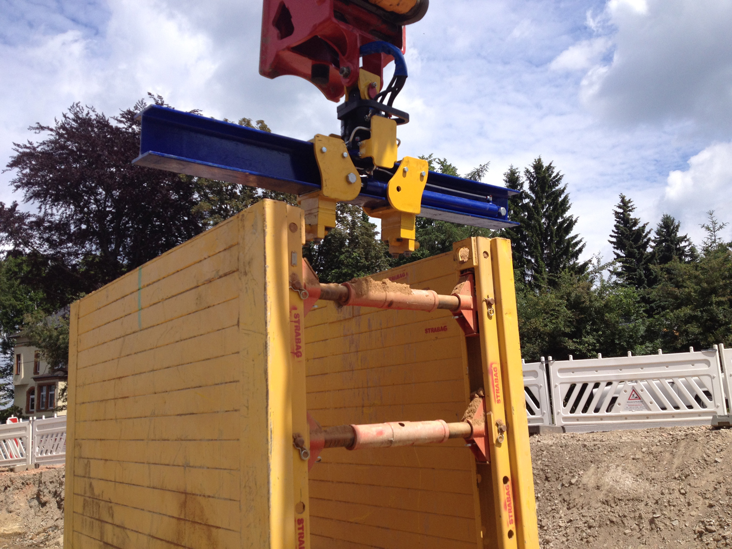 Dieser Greifer ermöglicht im Kanalbau das sichere Heben, Ziehen, Versetzen und Transportieren der Verbauelemente und Verbauboxen ohne zeitintensives manuelles Anschlagen und Abhängen von Ketten. Die Verbaubox wird direkt und ohne zusätzliche Anschlagmittel aufgenommen.