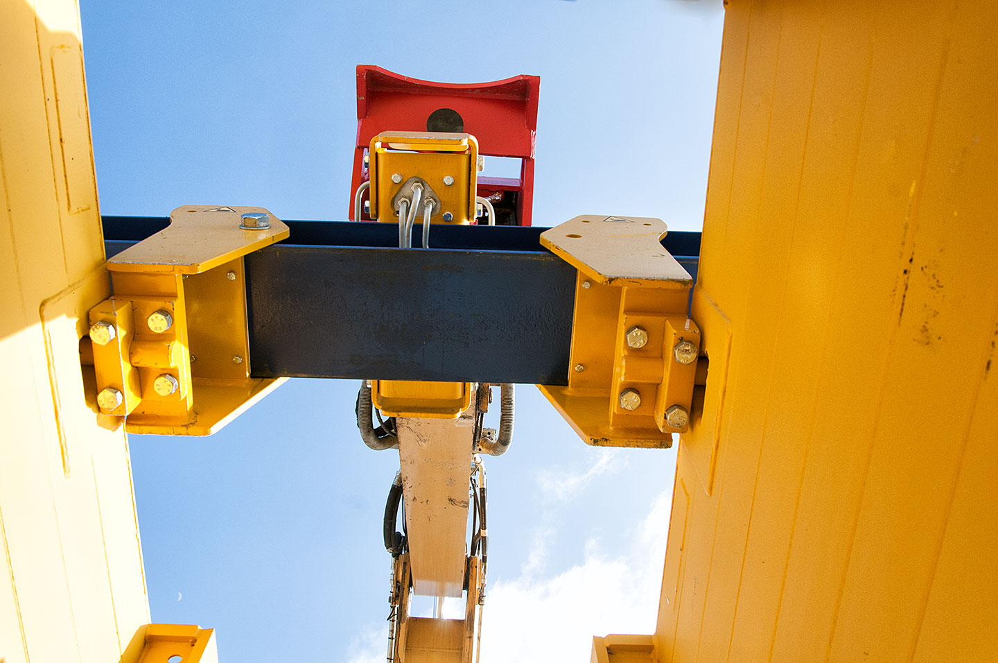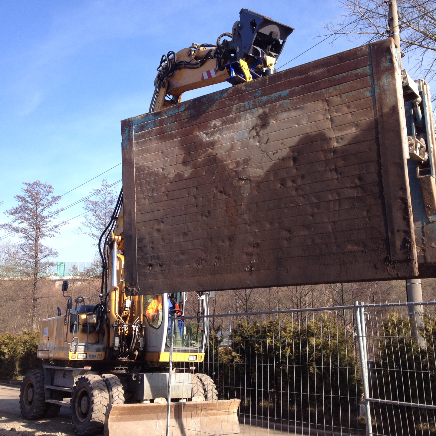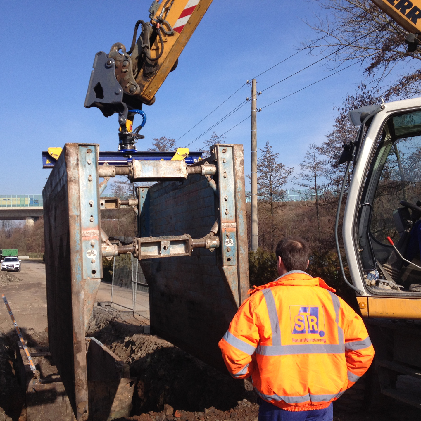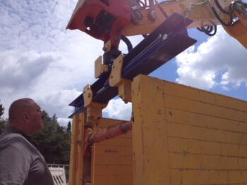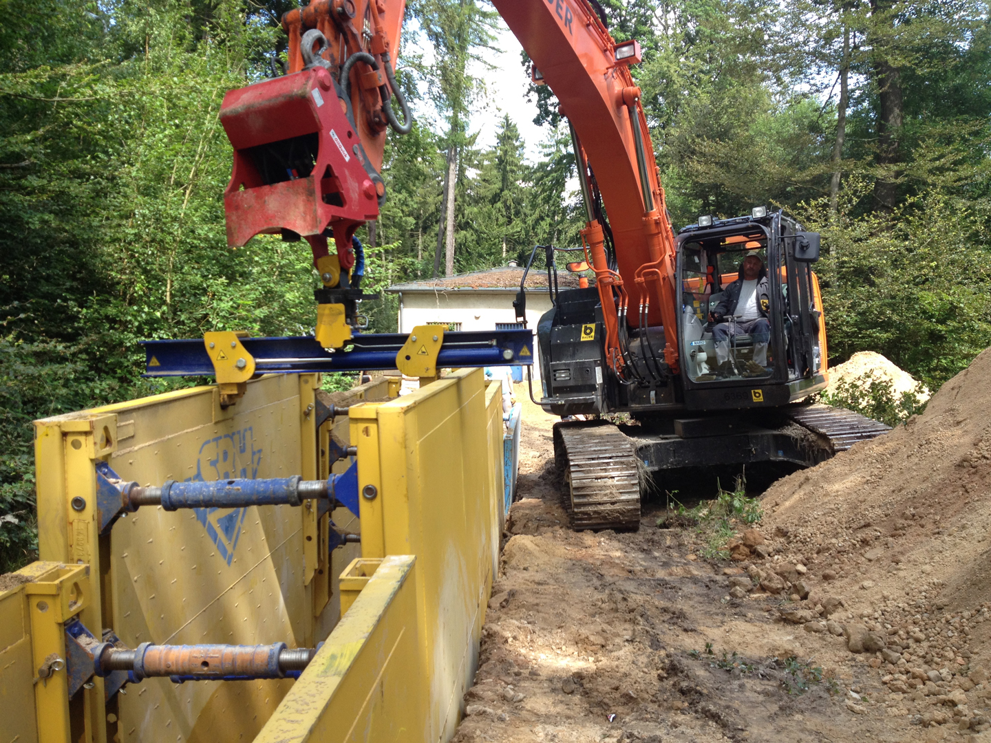 Dieser Greifer ermöglicht im Kanalbau das sichere Heben, Ziehen, Versetzen und Transportieren der Verbauelemente und Verbauboxen ohne zeitintensives manuelles Anschlagen und Abhängen von Ketten. Die Verbaubox wird direkt und ohne zusätzliche Anschlagmittel aufgenommen.